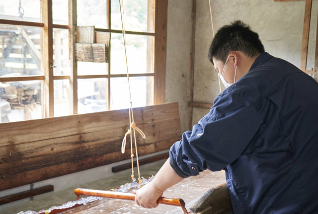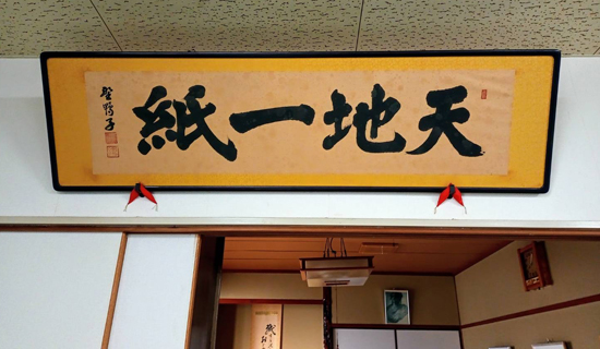 立春を機に、新宮産のミツマタで漉いてもらった為書きサイズの和紙に、大筆で墨を載せてみたものの、稚拙な筆跡を見れば見るほど失意に沈んでしまいました。そんな矢先、食品系からメディカル系までを手掛ける紙加工メーカーの本社でお目にかかったのは野鴨子の落款が押された「天地一紙」の書でした。けんじが提唱する「超ペーパーレス宣言」は、「万が一オフィスから紙が消えてしまっても、四国中央市の紙は、あなたのくらしを支え続けます!」というもの。「紙はその上辺から下辺までが一枚の紙である」とう解釈が正しいかどうか定かではないものの、「お札と切手以外は何でもそろう」という日本一の紙のまちも、この先に激変する社会構造や生活様式と縮充型の地域経営を考えるとき、業界団体や企業のみなさんの新たな協調・融和・団結により、「一枚の紙」となることが至上命題であろう…と、野鴨子が示唆してくれました。