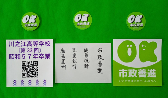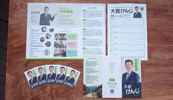 ひとと地球にやさしいまちへ…「開かれた協働の市政を善進させる」けんじの基本姿勢をコンパクトにまとめて市民のみなさんにお伝えする大小2種類の政策討議資料(パンフレット)が、印刷・加工から仕分けまで大勢の方々のご協力の下に出来上がりました。大西けんじ応援隊(後援会)への入会申込書、プロフィールカードとともに、一人でも多くの方にお届けしたいと思います。