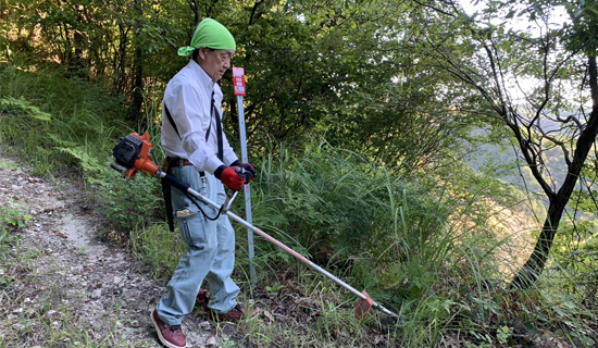四国中央登山ムーブメントのメンバーを中心に、9名のボランティアが香川県境の切山地区にある大谷山の登山道の草刈り・除草・整備に集まりました。11月2日に「de愛イベントVol.1~オオタニサンで山歩き恋活」と銘打って開かれる山登り婚活のために、林業家で山岳ガイドの松本さんのアドバイスの下で、新しい恋の芽生えを期待しながら心地よい汗を流した朝の2時間でした。