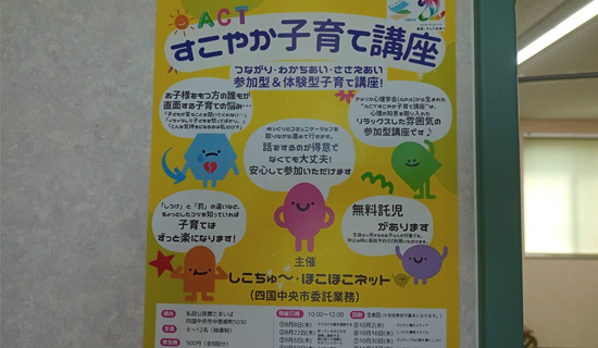 香川短大の小松先生をファシリテーターとして、体験型(全8回)の「ACTすこやか子育て講座」が中曽根町で開かれています。この講座は、アメリカ心理学会が開発した暴力及び虐待防止を目的とした育児支援プログラムで、今回は四国中央市の委託事業として、けんじが所属する「しこちゅ~・ほこほこネット」が主催。受講生は8人でけんじもスタッフとして参加しています。