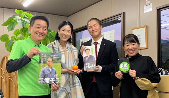 このたびの四国中央市議会議員選挙でみごと議席を勝ち取られた宮崎さんと村上さんが、けんじ事務所にご来訪。間もなく就任される22名の議員各位には、二元代表制の一翼を担う選良として市民の負託に応えるべく議員活動に精励され、本市の発展に寄与されますことをご期待申し上げます。けんじも微力ながら、この地に生まれ育った者の一人として、持てる限りの力を尽くしてまいります。また、次期西条市議選を目指す農業青年の三浦さんもご同行されており、こんなエネルギッシュな皆さんと、誕生月の違う同級生になれたら楽しいだろうな…などと年甲斐もなく思いつつ、選挙の苦労話に耳を傾けました。
