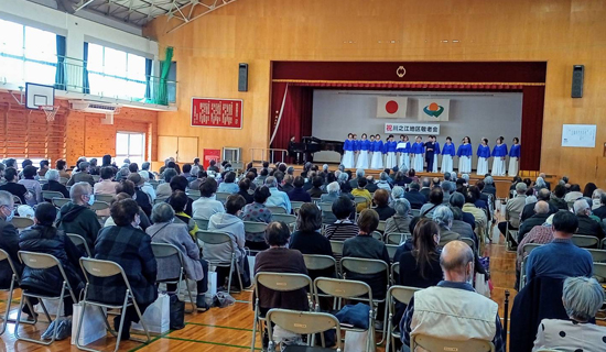 ロングラン敬老会開催の締め括りとして、師走ながらも小春日和に恵まれたこの日、川之江小学校体育館で川之江地区敬老会が開かれました。白寿・卒寿・米寿の方、ダイヤモンド婚式・金婚式のご夫婦などにお祝い状が贈られ、女声合唱団川之江の歌声や懐かしい唱歌などで心を和ませました。けんじは、午前中にご近所の敬老茶話会にお邪魔し、今年は片付けだけのお手伝いとなりました。